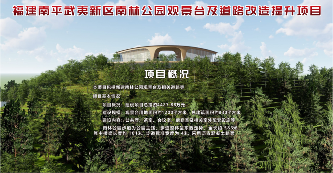 1月13日上午,福建南平武夷新區(qū)南林公園觀景臺及道路改造提升項目在南林公園舉辦開工儀式,該項目的代業(yè)主單位為福建省閩北水利水電工程公司。參加本次開工儀式的有:南平市武夷新區(qū)管理委員會、南平市城市公園服務(wù)中心、南平綠發(fā)集團有限公司、南平武夷新區(qū)城市發(fā)展集團有限公司、福建省閩北水利水電工程公司等主要單位及領(lǐng)導(dǎo)。 南林公園觀景臺及道路改造提升項目本項目包括新建南林公園觀景臺及相關(guān)道路等。建設(shè)項目總投資4427.88萬元。建設(shè)規(guī)模為觀景臺用地面積約1200平方米,總建筑面積約830平方米,建設(shè)內(nèi)容包含公共廳、茶室、會議室、后勤室及相關(guān)室外配套設(shè)施等;南林公園步道為公園主路,步道整體呈東西走勢,全長約 583m,其中橋梁長度約 101m,步道標(biāo)準(zhǔn)寬度為 4m,采用瀝青混凝土路面。