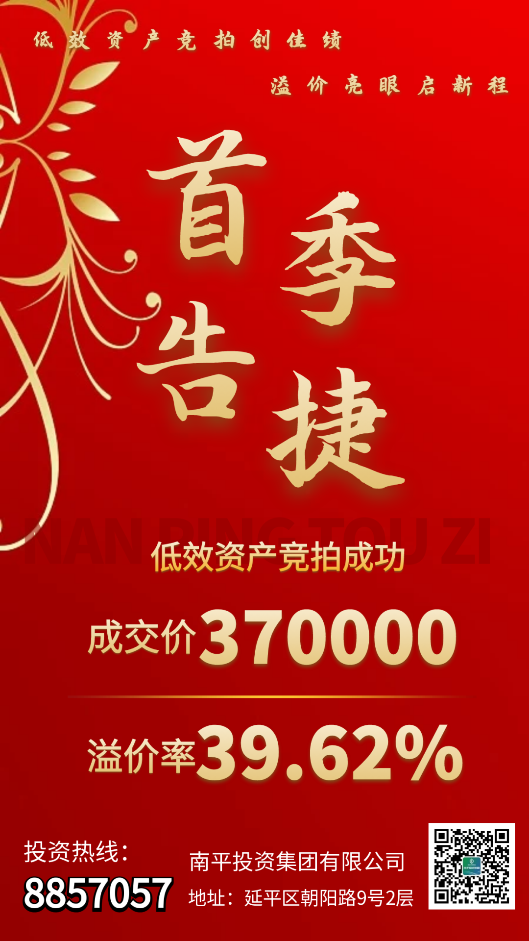 3月25日,投資集團通過南平市產權交易有限公司公開掛網招租的福建省南平市蔬菜食雜公司后谷倉庫,采用網絡競價模式,吸引了4名投資者的激烈角逐。經過多輪競價,最終以37萬落槌,溢價率達39.62%,遠超預期。 后谷倉庫的高溢價成交,不僅是資產盤活的一次突破,更標志著公司市場化運營能力邁上新臺階。此次成交充分彰顯市場對公司優(yōu)質資產的認可,不僅直接拉動公司資產收益增長,更展現了資產運營團隊的專業(yè)能力。 下一步,公司計劃將更多低效資產進行整合升級,通過定制化招商與多元化合作模式,推動資產增值與運營效率雙提升,為全年業(yè)績目標達成提供堅實保障。公司將以“拼”的干勁、“搶”的姿態(tài)、“實”的作風,奮力書寫高質量發(fā)展新篇章!