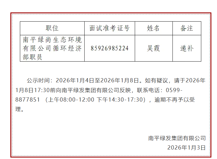 南平綠發(fā)集團有限公司公開招聘擬遞補聘用人員公示